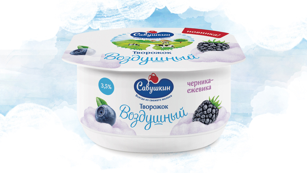 Десерт «Воздушный» — новый продукт в линейке творожков «Савушкин». Это творожная паста с фруктами, взбитая в нежную пену. При разработке дизайна упаковки важно было рассказать про особенную консистенцию, выделить SKU в линейке, но сохранить визуальную принадлежность к ней.