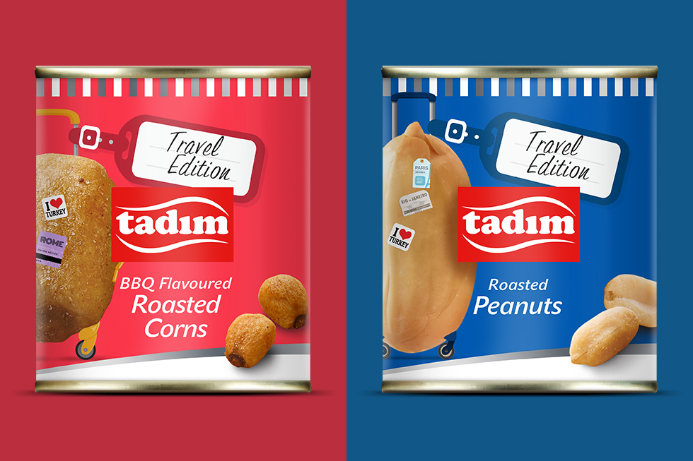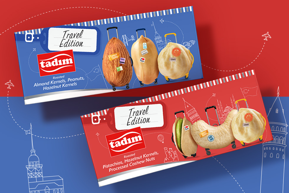 Турецкое агентство Orhan Irmak Tasarim разработало дизайн упаковки для снеков Tadım. Турецкий производитель орехов и сухофруктов выпустил 6 вариантов снеков специально для продаж в магазинах дьюти-фри.
