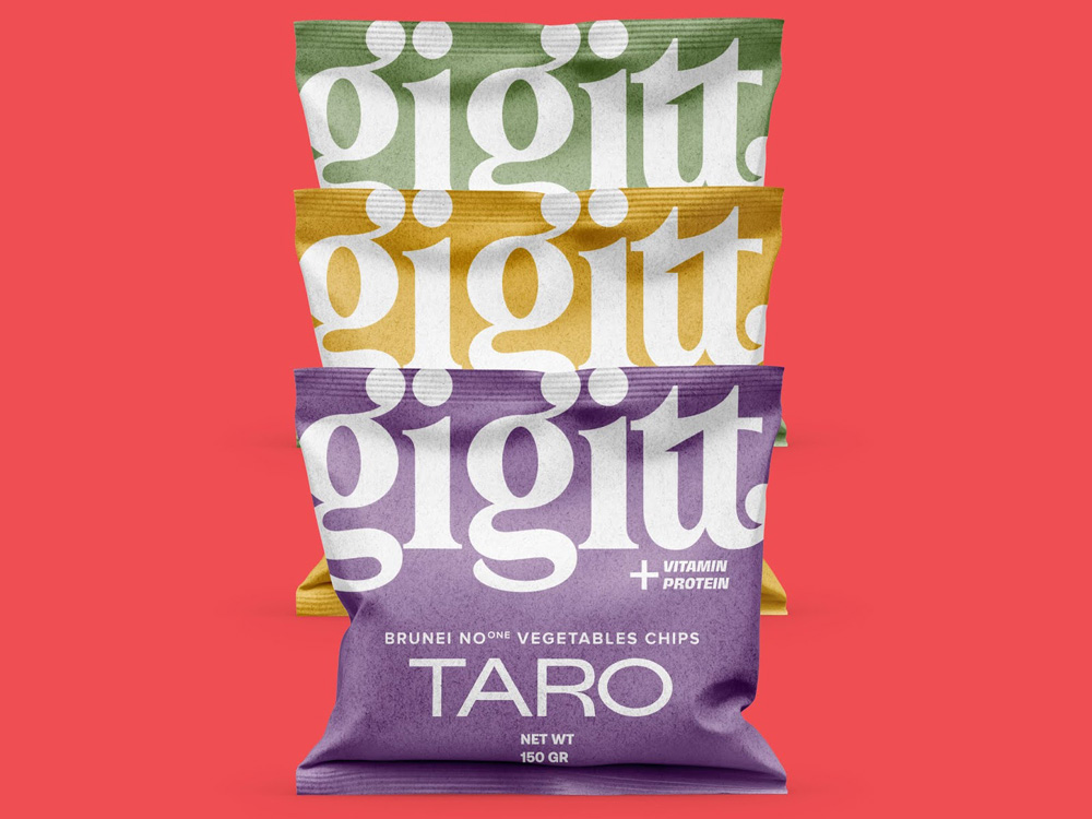 Студия Widarto Impact (Индонезия) представляет дизайн упаковки для овощных снеков GIGIT. Дизайнеры решили обойтись без изображения овощей, потому что это слишком часто используемый образ на упаковке снеков.