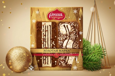 Брендинговое агентство Depot провело масштабную подготовку линеек бренда «Россия» – Щедрая Душа!® к новогодним праздникам. Упаковки конфет и шоколадных плит украшены россыпью золотых звёзд и снежинок.
