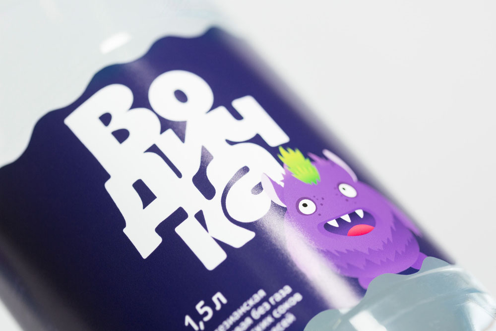 Этикетки сразу же показывают, что вода предназначена для детей. Дружелюбный монстр и характерная волнистая линия делают упаковку узнаваемой издалека, а крупные буквы хорошо читаются даже на маленькой бутылке. Волнистые ребра бутылки поддерживаются волнистыми краями этикетки.