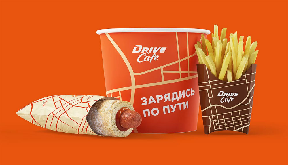 Следующим шагом стало формирование нового фирменного стиля, способного ясно передать ключевые идеи платформы бренда. Особенность задачи заключалась в том, что в рамках разработки фирменного стиля нужно было создать универсальную дизайн-систему. Она, с одной стороны, должна подходить к пищевым продуктам, а с другой — работать и на многочисленные расходные материалы, встречающиеся в кафе: стаканы, салфетки, специи и так далее. Ну и конечно, графическое решение должно было стать логическим продолжением позиционирования марки Drive Cafe.