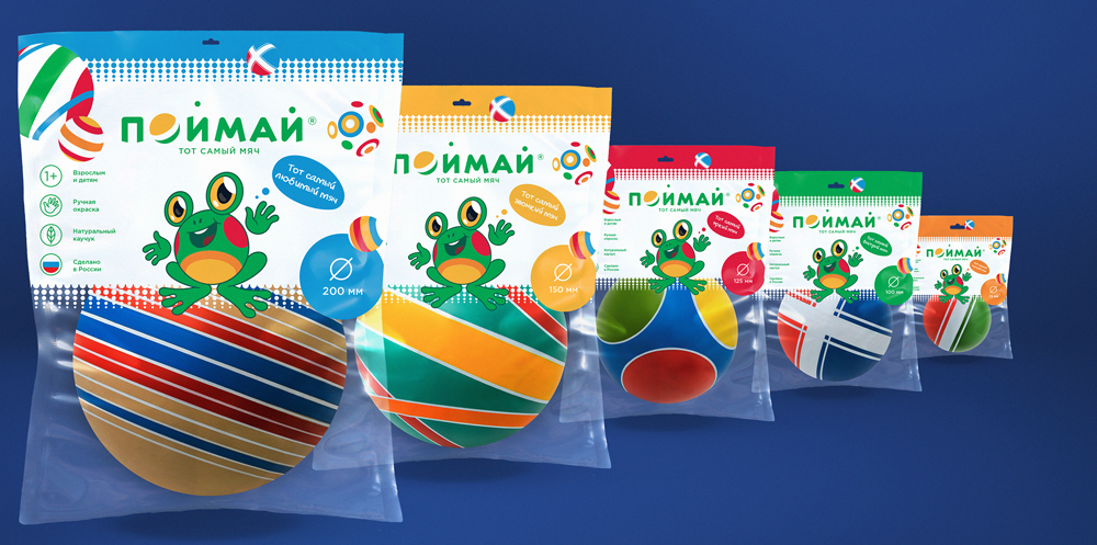 Фирменная графика построена из яркой и узнаваемой росписи мячей «Поймай», выделяет товар и позволяет легко идентифицировать его на полке. Узоры располагаются в форме мяча, придавая объем и динамику носителю, ощущение присутствия «того самого мяча» — круглого, упругого и приятного на ощупь, знакомого и любимого с детства.
