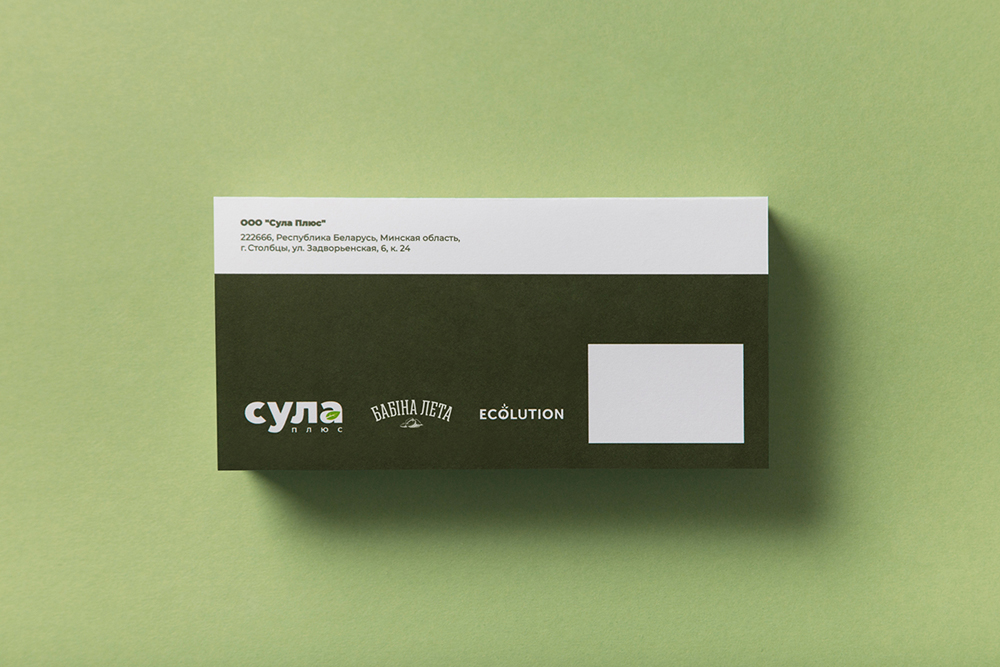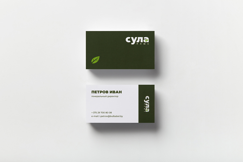 Для «Сула Плюс» был разработан лаконичный визуальный образ, отсылающий к натуральности. Крупный шрифт логотипа подчеркивает солидность и уверенную позицию компании на рынке, а графический элемент — листок — природное происхождение продукции. Фирменный стиль основан на цветах свежевспаханной почвы и растительности.