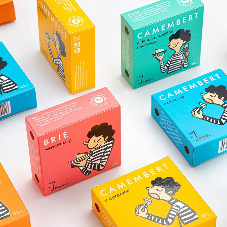 Логотип дополняет бренд-персонажа. С одной стороны, он выполнен в виде подписи, а с другой — первая буква «J» воссоздаёт контур его лица. Разведение камамбера и бри выполнено за счёт разных сюжетов иллюстраций. Для дифференциации по вкусам задействован цвет, чтобы потребитель легко ориентировался в продукте.