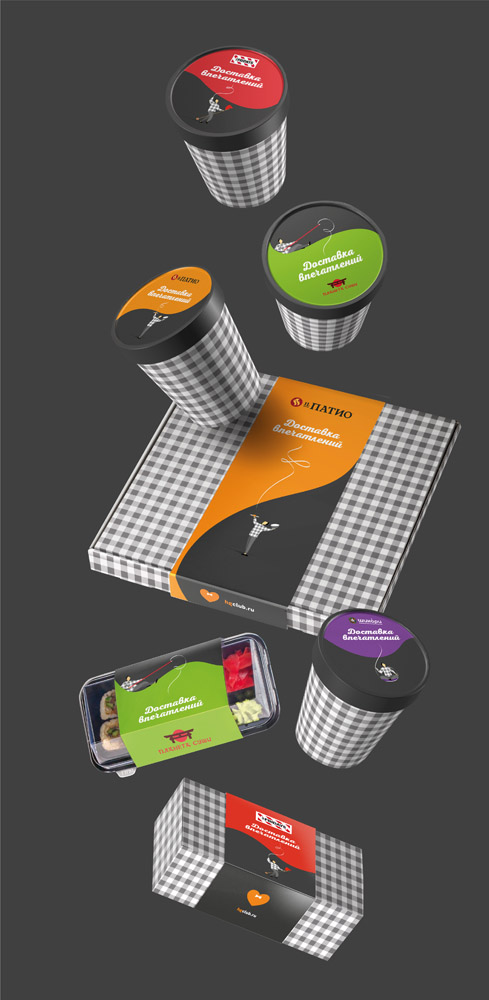 На основе созданной стилистике были созданы упаковки и забрендирована вся продукция доставки “Почётный Гость”.