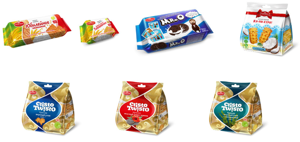 Сахарное печенье таких торговых марок как «Юбилейное чаепитие», «Добрая корова «ТОПЛЕНОЧКА» с марта 2020 года выпускается в мини-формате 100гр., и 108гр., совсем юное, но не менее любимое печенье «Мистер О» с какао и начинкой со сливочным вкусом вы можете найти на полках магазинов в семейном формате 245гр. Новинкой этого года стало сдобное печенье «Ка-ма-кура!» с кокосом, вес яркой упаковки 200гр. Зарекомендовавший себя крекер ТМ «Cristo Twisto» Вкусный улов обновлен новыми удобными упаковками весом 200гр.