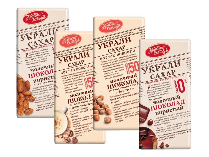 Кондитерская фабрика «Красный Октябрь», входящая в Холдинг «Объединенные кондитеры», удивила своих покупателей неожиданной новостью, размещенной на упаковке нового молочного шоколада. Согласно ей, произошло похищение сахара с кондитерской фабрики, побудив технологов разработать шоколад без сахара.