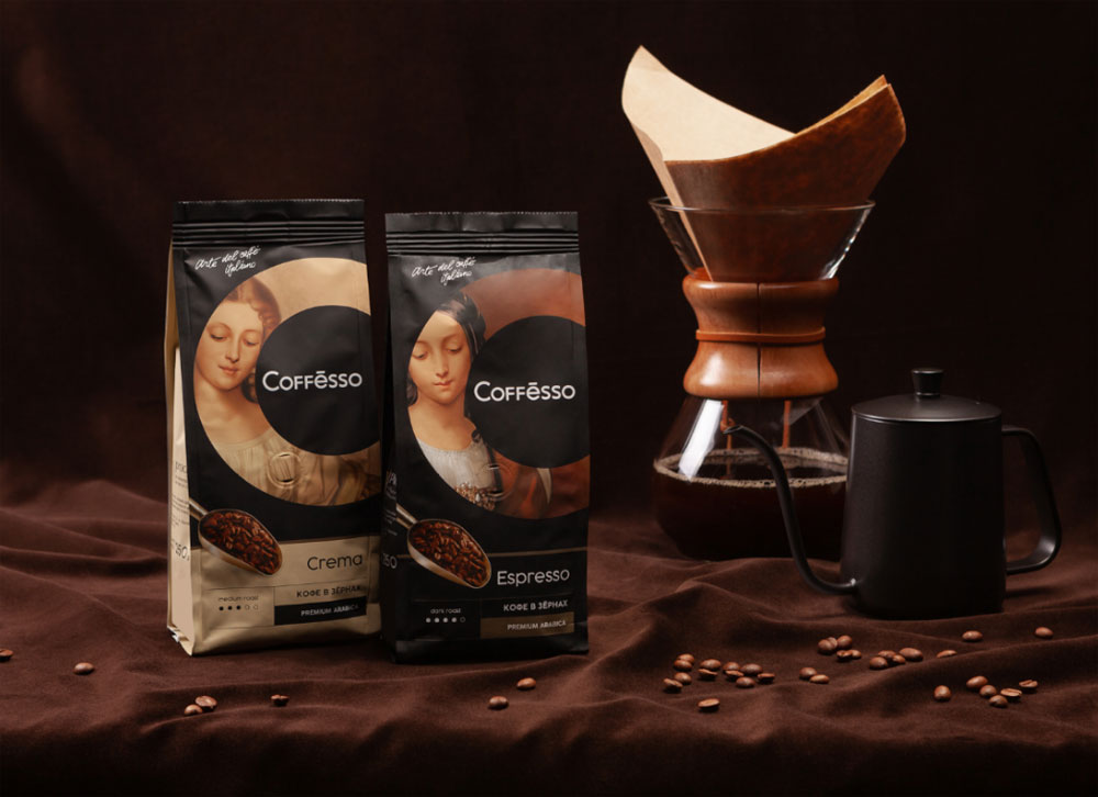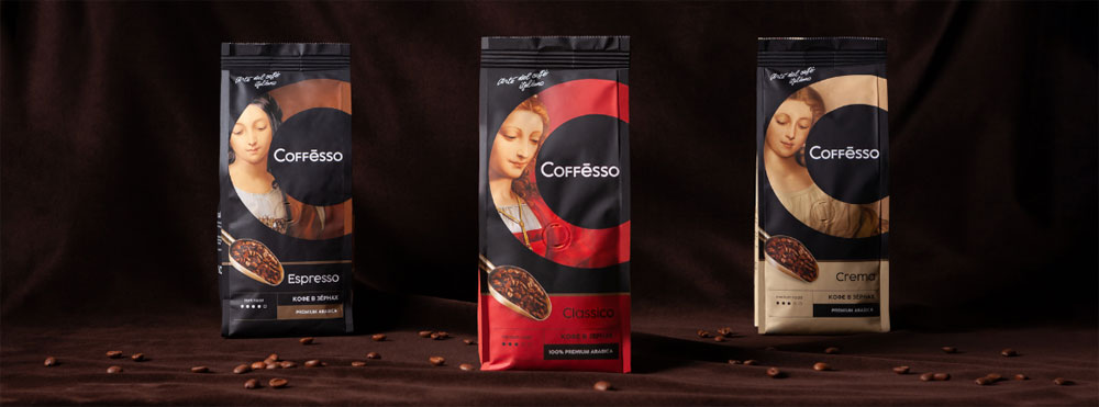 В агентстве «Гордость» разработали дизайн упаковки кофе для тех, кто придаёт особое значение вкусу и ценит итальянское кофейное искусство. Страсть итальянцев к красоте родила самых талантливых художников, известных во всем мире. Именно Италия считается родиной высокого искусства и одной из самых «кофейных» стран в мире. Coffesso – это та Италия, где вкус и искусство встречаются вместе. Эта мысль легла в основу дизайна, в котором дизайнеры использовали иллюстративные образы женщин эпохи Ренессанса как аллюзию на итальянское творчество. Фрагмент литеры ‘С’ вторит названию торговой марки и деликатно кадрирует изображение, создавая цветовой акцент.