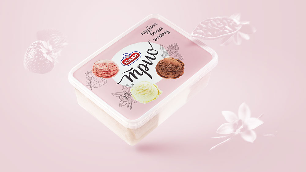 Мороженое «Трио» – саббренд зонтичного бренда «Юкки» от компании «Санта Бремор». Особенность продукта в том, что в одной упаковке находятся три вида мороженого. В отличие от содержимого, дизайн упаковки «Трио» со временем начал терять актуальность – выглядел морально устаревшим, не соответствовал современным графическим трендам. Назрела очевидность редизайна, который провели специалисты AVC.