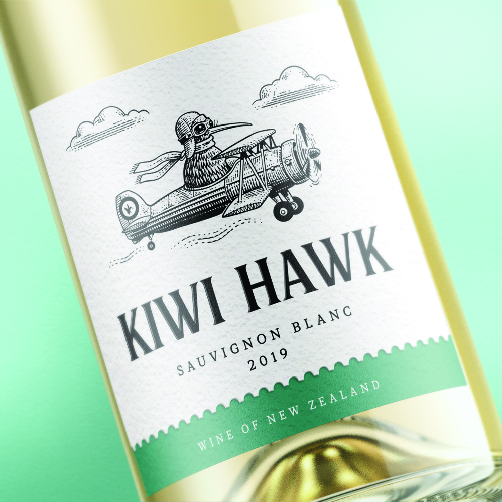 В качестве талисмана бренда дизайнеры выбрали птицу киви. Эта птица – символ Новой Зеландии, она обитает только в этой стране и не способна летать. Вино получило название Kiwi Hawk, а этикетка повествует о птице киви, которая очень хочет полететь. Иллюстрации выполнены в ретростиле гравюры на дереве. Детализированный, серьезный рисунок добавляет комичность в историю бренда.