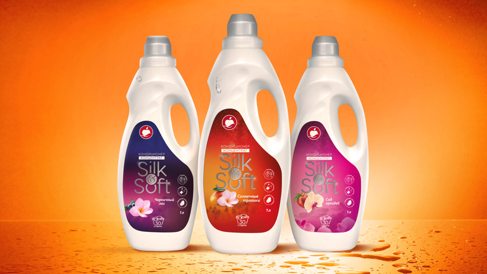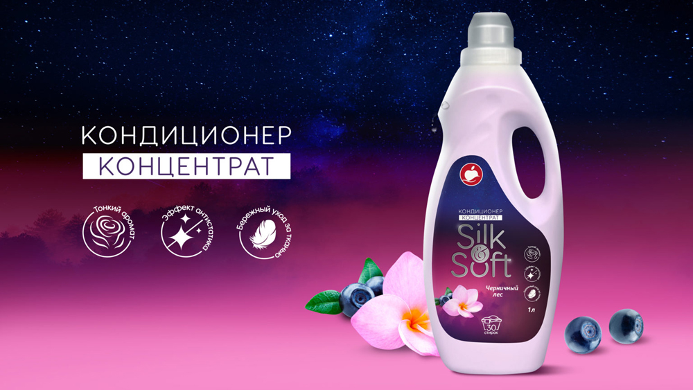 Перед специалистами студии стояла задача разработать категорийную дизайн-концепцию линейки кондиционеров для белья Silk & Soft. Эта линейка выпускается в среднем ценовом сегменте под общим зонтичным брендом «Самбери». На старте продаж в нее вошли три вида товаров с оригинальными ароматами: черничный лес, солнечные тропики и сад орхидей.