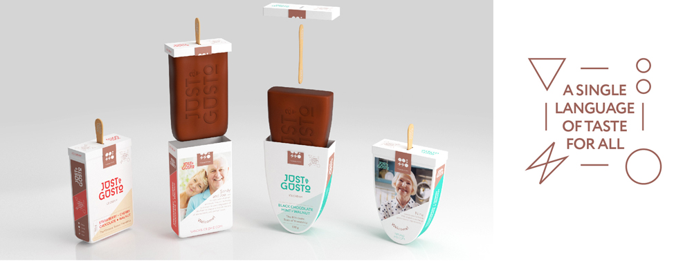 Вкус — это новый всемирный язык. Об этом сообщает второй бренд мороженого JUST A GUSTO. Это новая возможность для общения и для понимания друг друга. Мороженое можно съесть, как обычное эскимо, удерживая его за палочку. А можно перевернуть и съесть его прямо из упаковки, предварительно вытянув деревянную палочку-ложку из мороженого. Упаковка выполнена из бумаги и представлена в двух формах: округлая и прямоугольная, а ложка-палочка сделана из дерева.