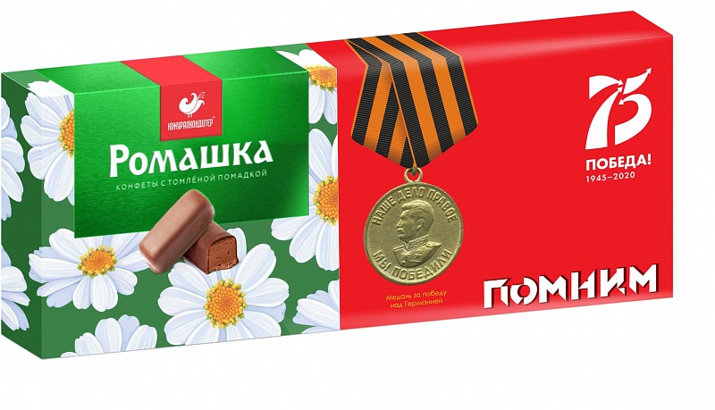 К юбилейной дате 75-летия Победы фабрика «Южуралкондитер», входящая в состав Холдинга «Объединенные кондитеры», подготовила коллекционную серию конфет «Ромашка» в коробках.