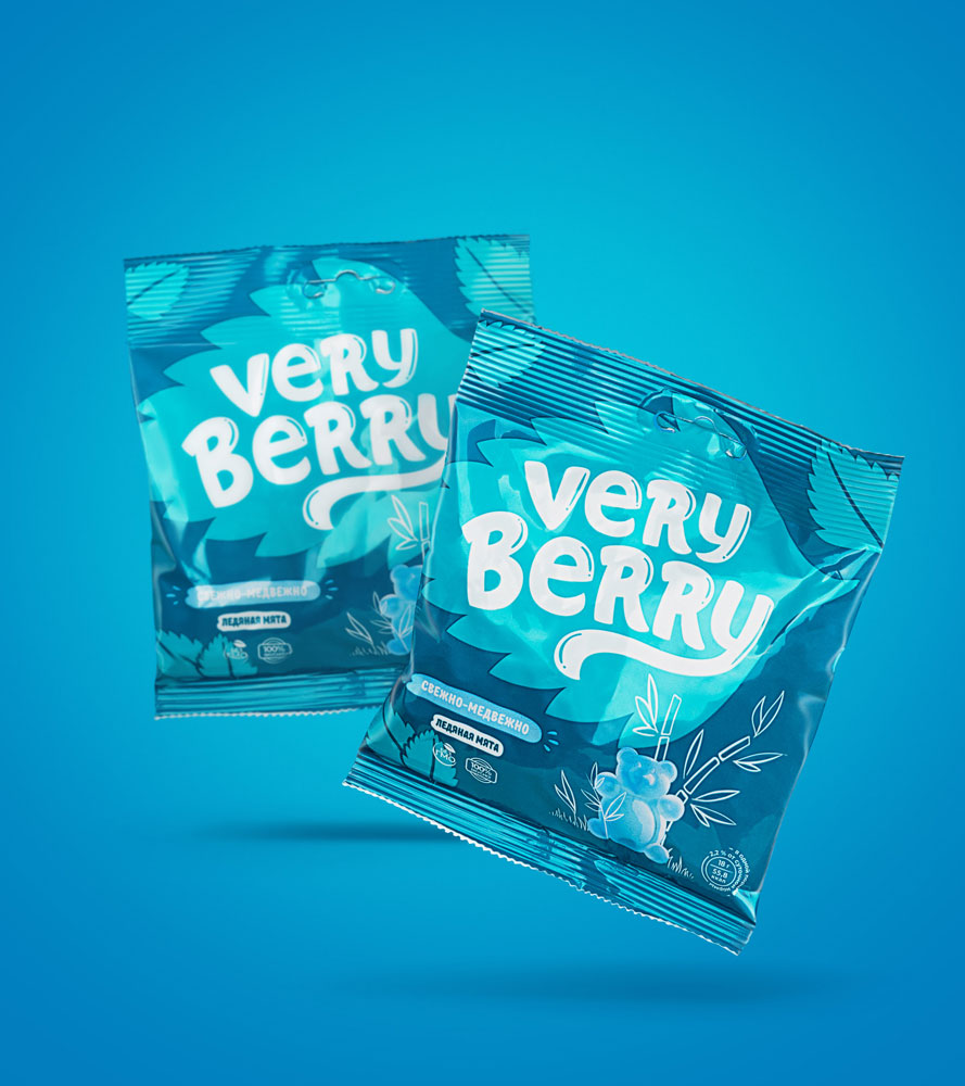 Название "Very Berry", благодаря своей рифме, быстро запоминается и отражает простоту продукта — в нем вы не увидите каких-то «экстремальных» вкусов, только те, что вам точно понравятся. Ключевым элементом дизайна упаковки стала бренд-зона: дружелюбный леттеринг, плашка в виде фрукта/ягоды и яркая цветовая гамма — что повышает бренд-идентичность. Милые названия SKU вместе с иллюстрированной фудзоной сразу же дают понять потребителю, какой вкус его ждет внутри пачки.