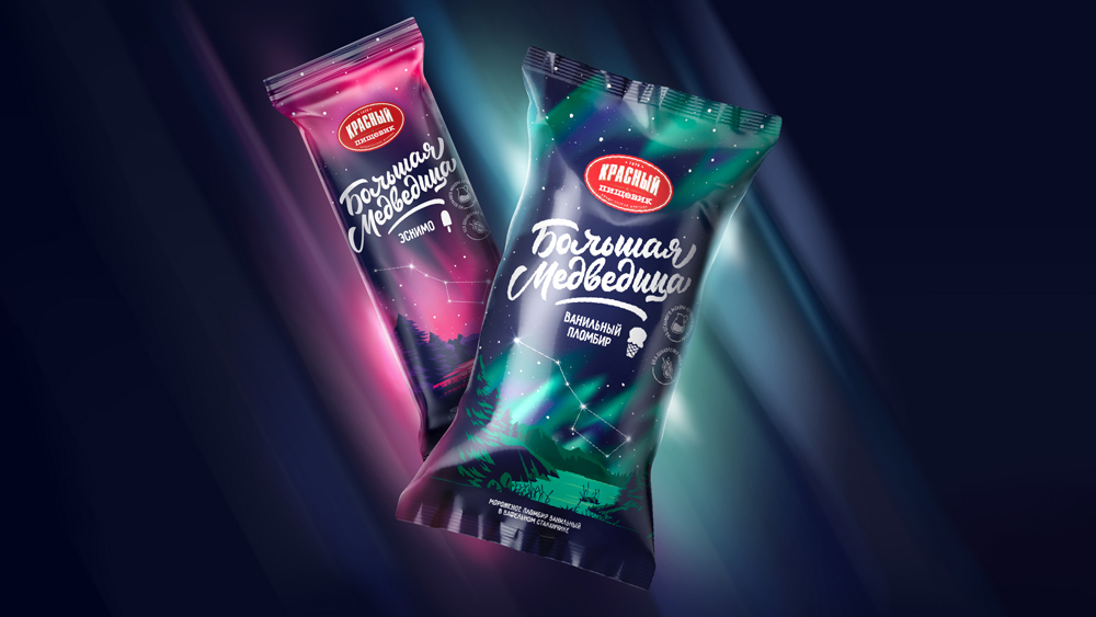 Классическое мороженое - массовый продукт, который любят и взрослые, и дети, поэтому название и дизайн должны быть интересны и понятны всем. Название “Большая медведица” у каждого вызывает свою уникальную, но все равно теплую ассоциацию, кого-то отсылающую к прогулкам под звёздами, кого-то - к добрым советским мультфильмам, кого-то - к холодной зимней ночи, когда самое известное созвездие видно везде и узнаваемо всеми.