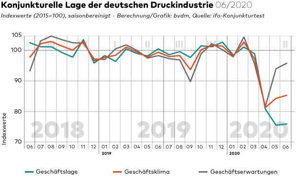 Деловой климат в немецкой полиграфической и медиаиндустрии смог продолжить начатый в мае курс на восстановление. В июне 2020 г. индекс делового климата, рассчитанный союзом bvdm, с учётом сезонных колебаний вырос на 1,2% по сравнению с предыдущим месяцем, составив 85,2 пункта. По сравнению с предыдущим годом, этот показатель снизился на 14,2 пункта.