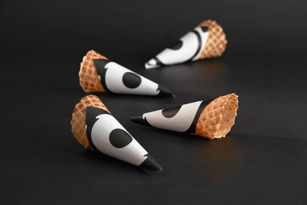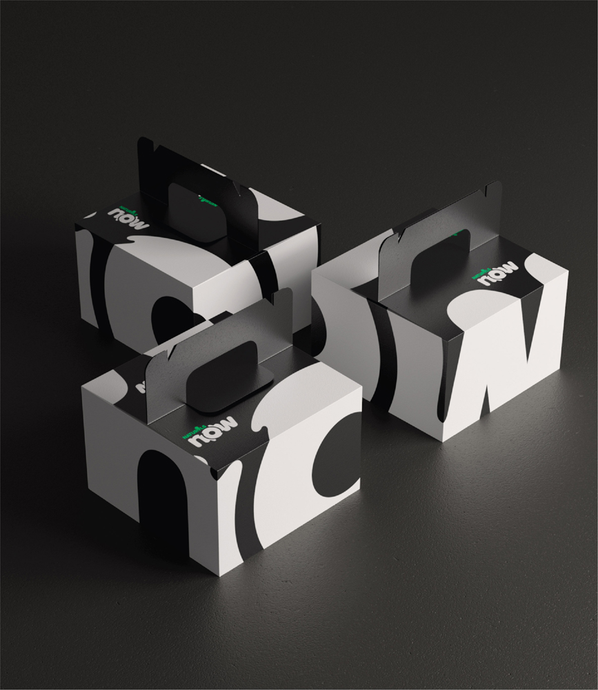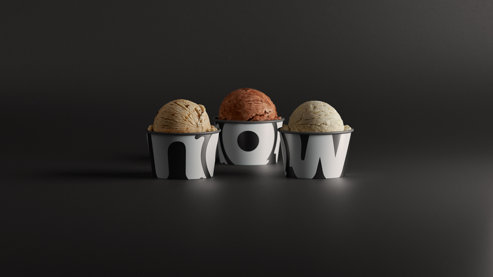 Дизайн упаковки выполнен в лаконичной черно-белой цветовой гамме. Капля зеленого цвета в логотипе указывает на натуральность бренда. Слово 'Now' выполнено оригинальным шрифтом. Возникает иллюзия, что буквы расплываются, смешиваются. Таким образом, логотип хорошо отражает характер мороженого.