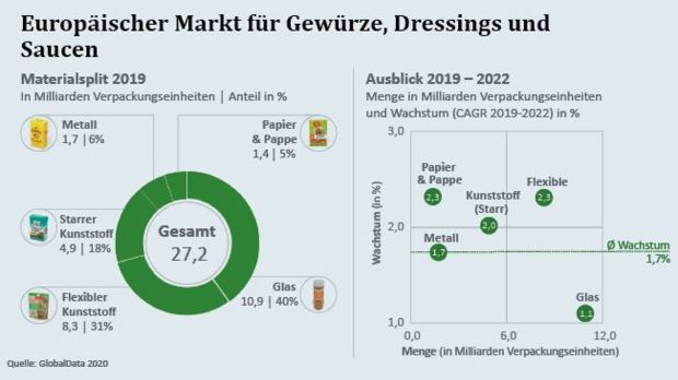 Берлинская консалтинговая компания B + P Consultants, выпустила исследование, посвящённое стеклянной таре для специй, заправок и соусов. Согласно отчёту, доминирующим упаковочным материалом для специй, заправок и соусов является стеклотара с долей 40%. Тем не менее, доля гибкой упаковки в этом сегменте растёт быстрее всего – на 2,3% в год.