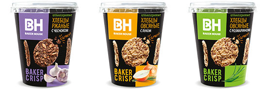 Цельнозерновые хлебцы ТМ BAKER HOUSE идеально вписываются в продуктовую линейку бренда и на сегодняшний день представлены в трех трендовых вкусах: овсяные с луком; ржаные с чесноком; овсяные с розмарином.