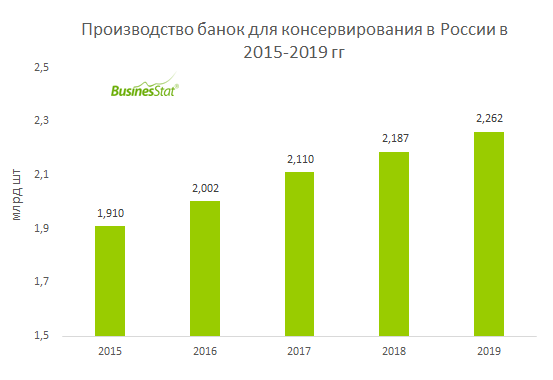 По данным , подготовленного BusinesStat в 2020 г, в 2015-2019 гг их производство в стране выросло на 353 млн шт или 18,5%. Ключевым фактором увеличения выпуска стал рост спроса со стороны консервной промышленности, основного потребителя банок для консервирования. Продуктовое эмбарго на ввоз ряда продуктов из-за рубежа, введенное в августе 2014 г, а также фактическое прекращение торговых отношений с Украиной способствовали импортозамещению в продуктовой отрасли России.