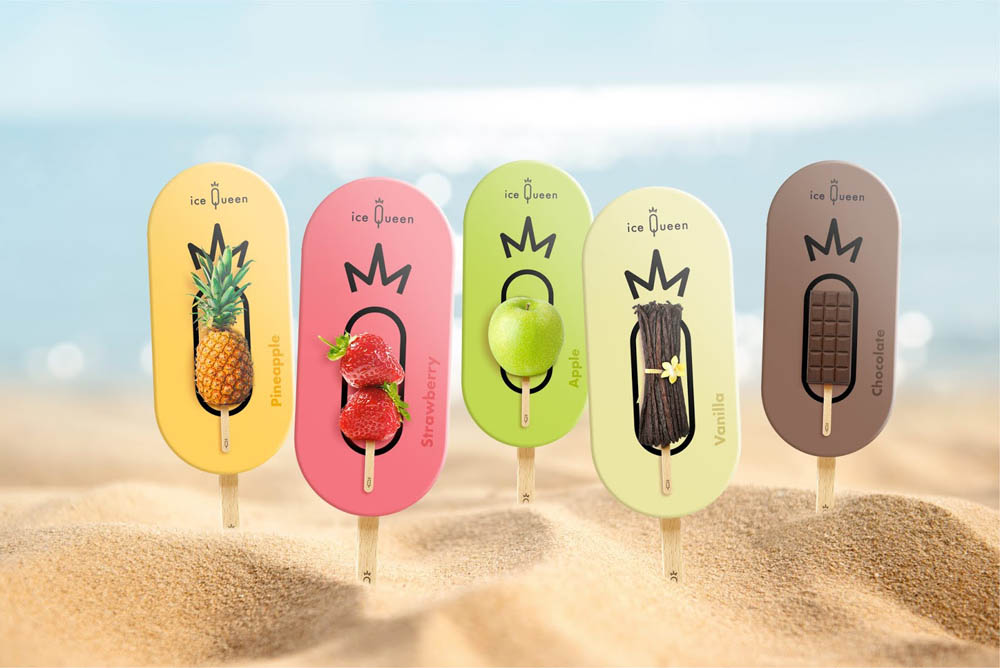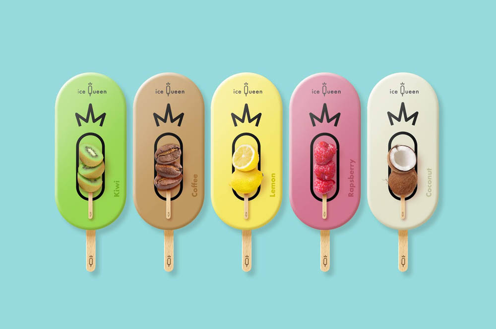 Название бренда – это игра слов, где соединяются Ice cream (пер: мороженое) и Queen (королева). У продукта очень простой, но эффективный логотип. Он говорит о благородности, натуральности продукта. Пиктограмма также очень лаконична – здесь угадывается форма сорбета, буква Q и корона. Силу логотипа смягчает пастельная цветовая гамма, которая говорит о натуральности.