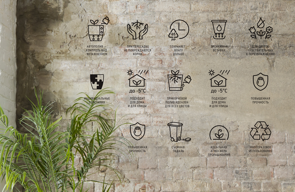 Особое внимание в дизайне упаковки уделено пиктограммам: исследование показало, что для покупателей в этой категории они особенно важны и облегчают процесс выбора. Помимо стандартных иконок, сообщающих о размере и литраже тех или иных горшков, наличии дренажных отверстий и возможности прикорневого полива, были разработаны значки и для таких сообщений, как например, «подходит для узкого подоконника».