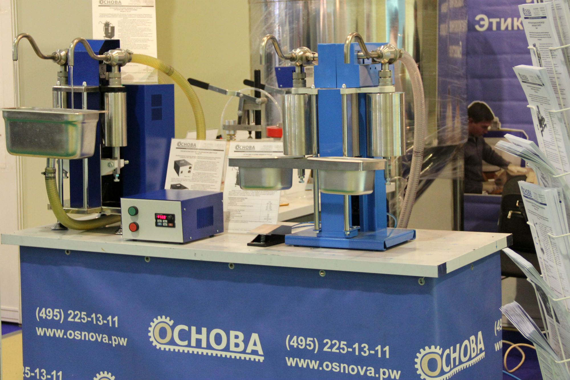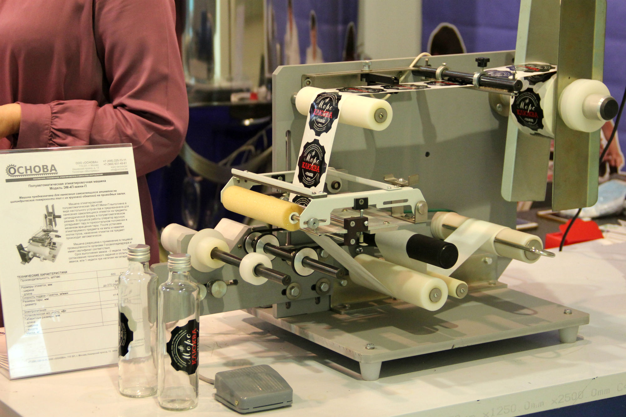 На стенде компании представлены установки розлива (установка УД-2 П с поворотным клапаном для розлива широкого спектра однородных и неоднородных жидких и пастообразных продуктов с температурой до 85 ⁰С дозами от 5 до 1000 мл, а также новая разработка – такая же установка, работающая от пневматики), устройства для укупорки разных видов (для закрутки ПЭТ-тары, запайки стаканчиков, вакуумирования банок с крышками «твист». Представлена также небольшая этикетировочная машина ЭМ-4П Мини-П для нанесения самоклеящейся этикетки. Она представляет собой настольное устройство для работы в полуавтоматическом режиме. В процессе работы оператор вручную укладывает тару в горизонтальном в механизм вращения тары. Нанесение этикетки на цилиндрическую тару происходит автоматически нажатием педали. Эта машина разрешена к применению в пищевой промышленности и имеет сертификат соответствия.