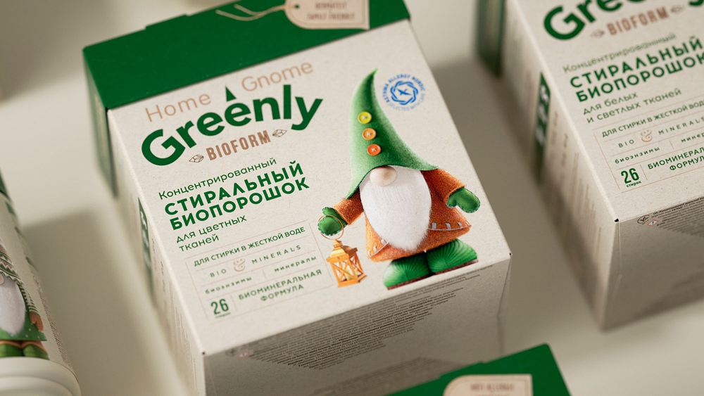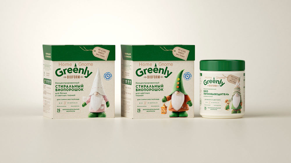 Поэтому команда агентства предложила идею голландского гнома как символа бренда. Эта тряпичная кукла традиционно выступает в роли символа домашнего уюта, благополучия и достатка. Его одежда и атрибуты меняются в зависимости от продукта и соответствуют его назначению: на средстве для стирки белых тканей гном Greenly в светлом, для цветного - в яркой куртке и колпаке.