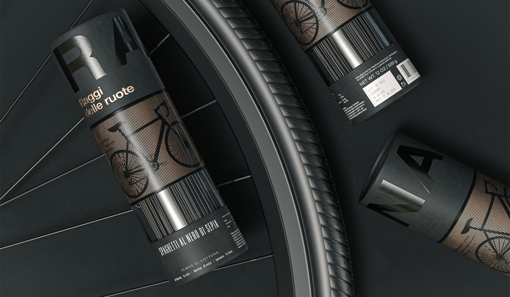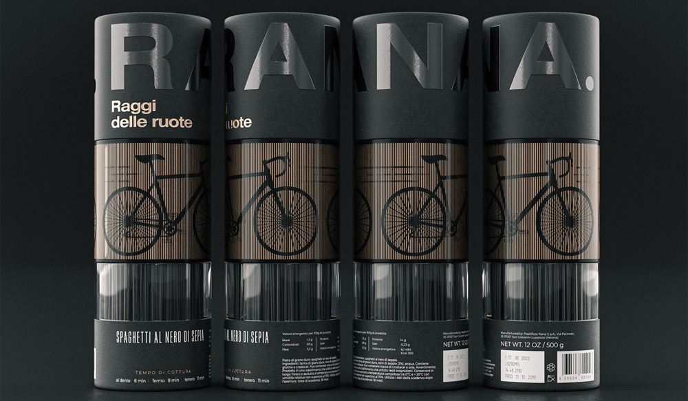 Команда ХРОМ разработала дизайн премиального бренда черных спагетти для концерна RANA. В основе концепции дизайна упаковки — метафора, сопоставляющая схожесть длинных спагетти и форму велосипедных спиц.