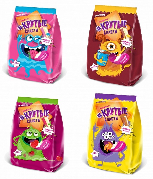 «#Крутые сласти»® – новинка, яркая и снаружи, и внутри! Смешные персонажи-монстры, изображенные на этикетках, сразу привлекают внимание юных покупателей. Каждый из них обладает запоминающейся внешностью и выраженным характером. Под яркими и веселыми обертками конфет скрываются пралиновые батончики с добавлением творога и гранул взрывной карамели. Такое контрастное сочетание впервые реализовано в традиционных пралиновых конфетах. Этот аппетитный «фейерверк» дополняют также четыре различных вкуса: карамель, какао, вишня и малина.