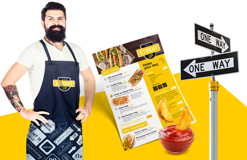В итоге команда клиента приняла решение запускать заведение под рабочим названием Streat.up. Оно не отсылает к основному продукту в меню, а скорее говорит о заведении в целом: Streat.up ― больше, чем просто уличная еда.