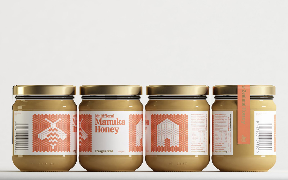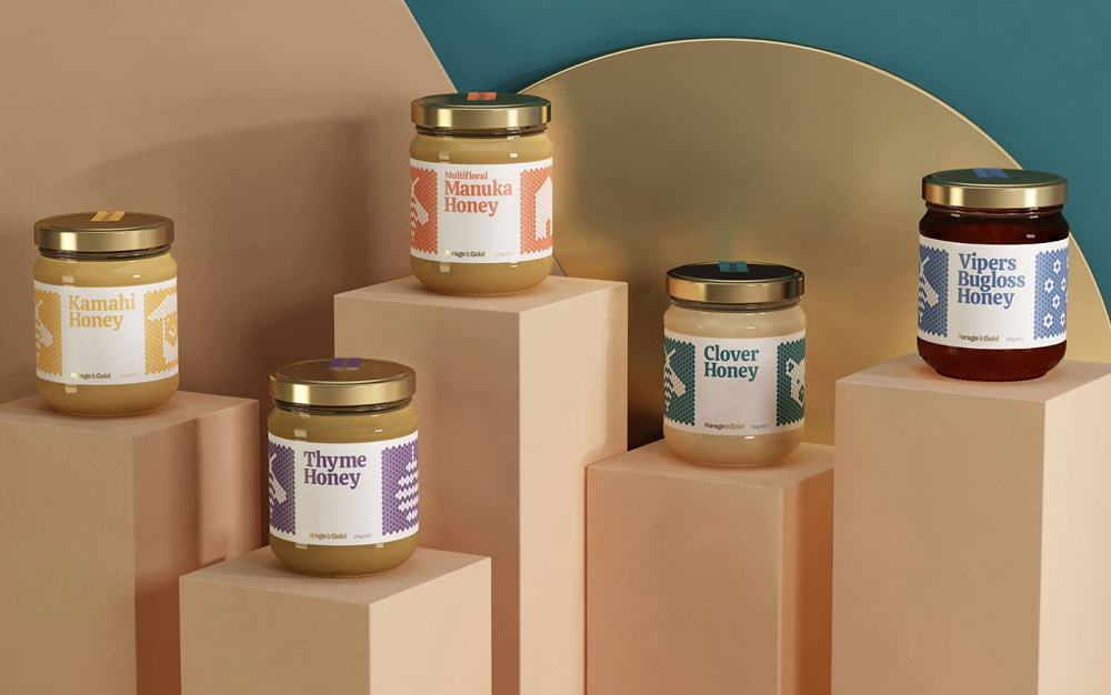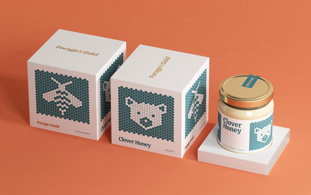 Для новозеландского производителя мёда Forage & Gold студия makebardo разработала дизайн упаковки. Пчелиные соты – идея не новая, но дизайнеры makebardo использовали их как мозаику для создания иллюстраций.
