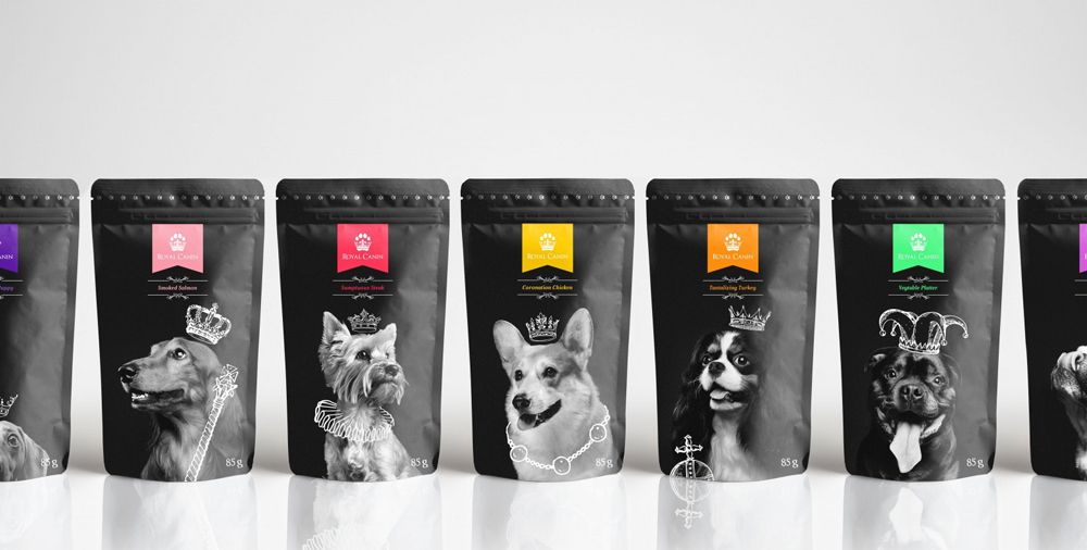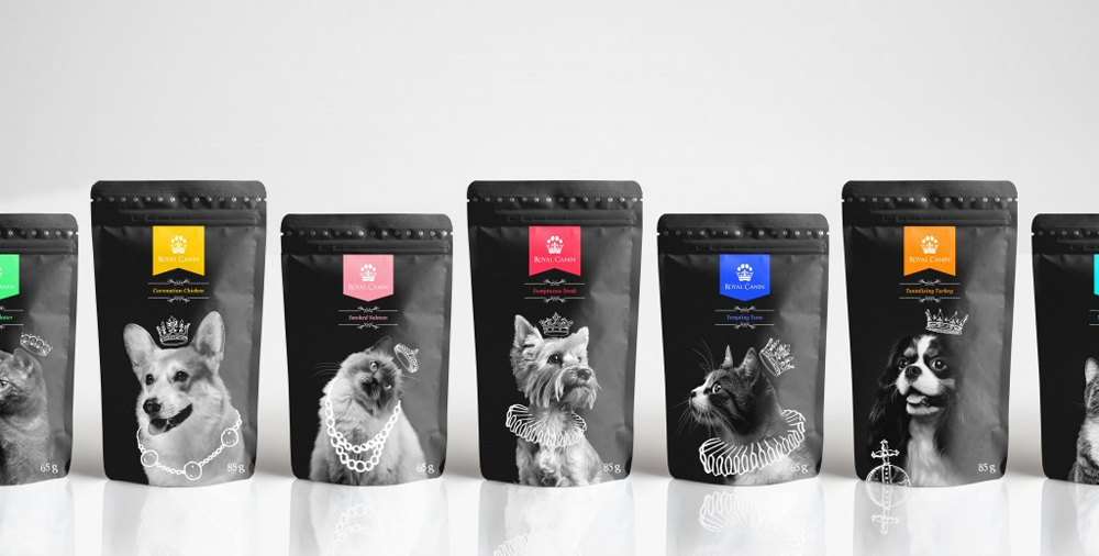 Томас Хардвик (Thomas Hardwick), студент Университета искусств Нориджа (Великобритания), представил концепцию нового дизайна упаковки питания для питомцев Royal Canin. Главной темой стала роскошь, а в логотипе объединились лапка и корона.