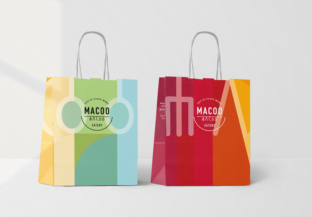 Кухонные инструменты вдохновили дизайнеров. Они как бы свисают с подставки, образуя название бренда “Macoo”. В дизайне используются яркие и теплые цвета. Для упаковки в студии выбрали биоразлагаемые контейнеры.