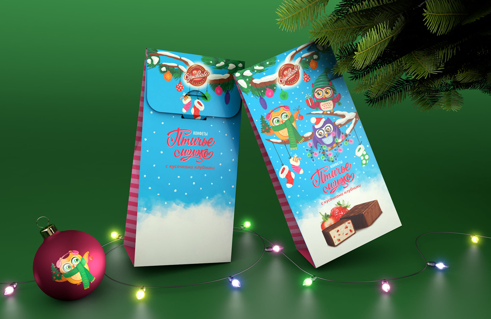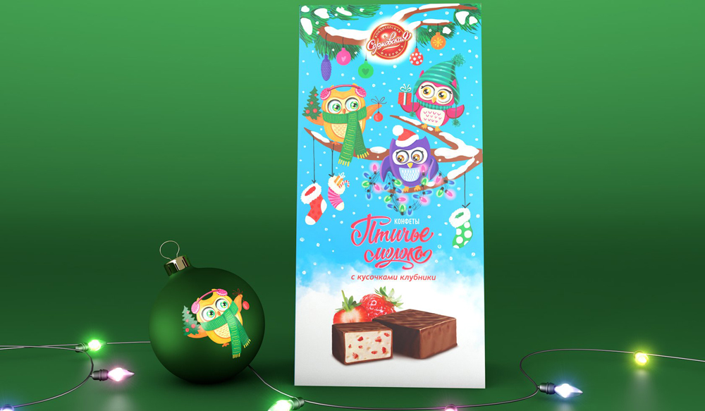 В основе дизайна коробки конфет - волшебство авторских иллюстраций. Яркая коробка не останется незамеченной на полке, семейство милейших сов, празднующих зимние торжества, не оставит равнодушными никого, их так и хочется пригласить в свою компанию, а вкус конфет не разочарует.