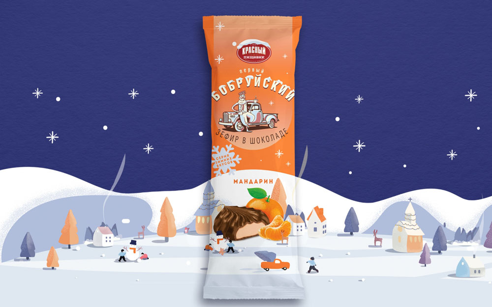 По заказу компании "Красный пищевик" брендинговое агентство Muffin Group разработало дизайн упаковки зимней серии зефира в шоколаде "Первый Бобруйский".