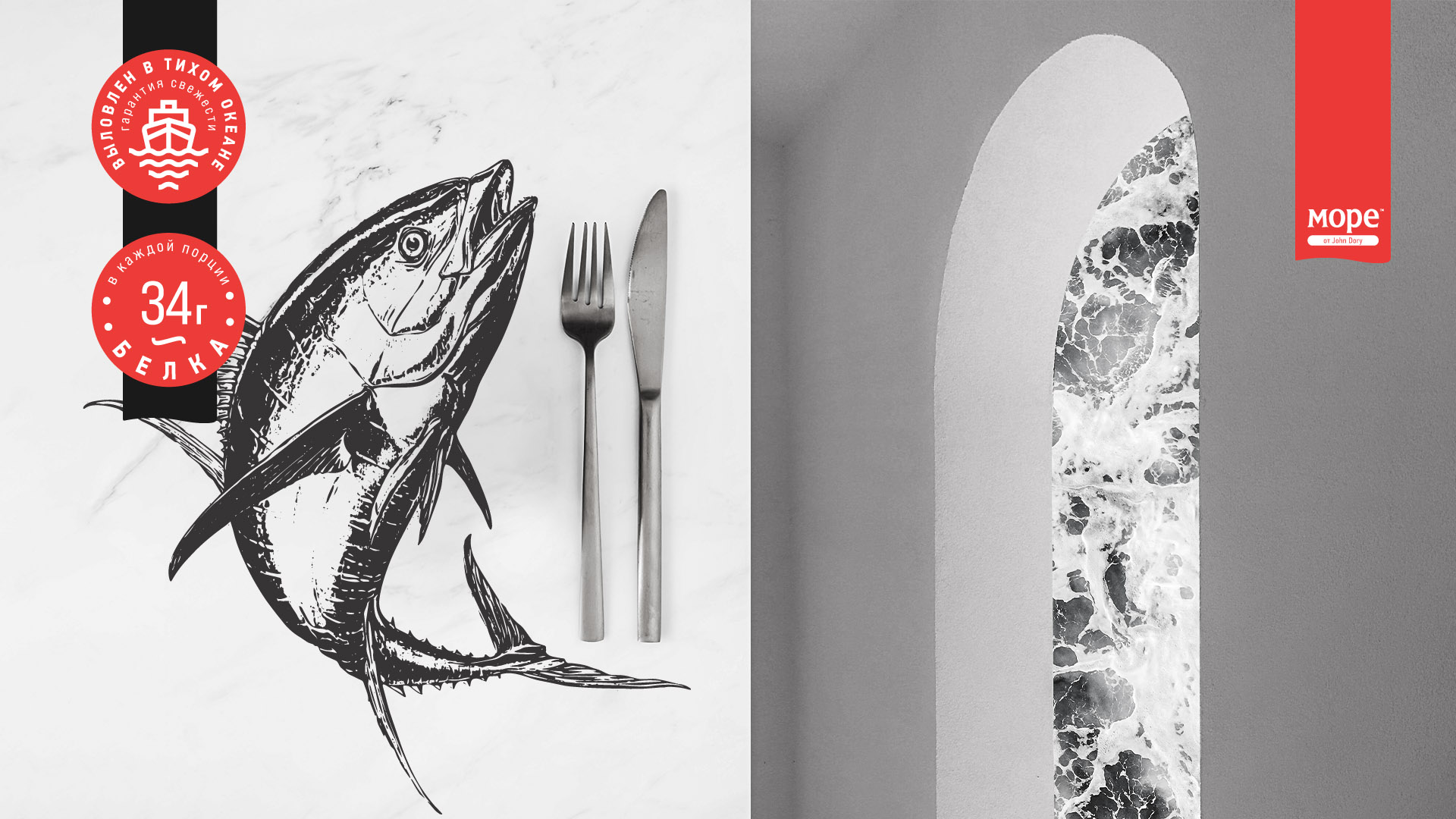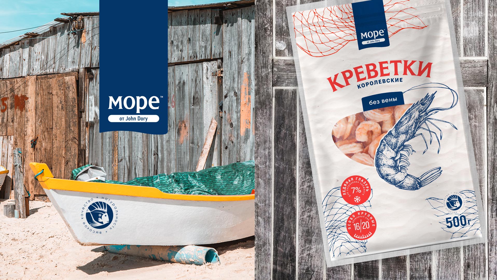 John Dory – это бренд с 7-летней историей, выстроенной на ассоциации с охлажденной рыбой и морепродуктами. Очередным шагом для развития стал выход на рынок замороженной продукции с новой линейкой «МОРЕ от John Dory», которая сохранила связь с зонтичным брендом как знаком качества. Так необходимостью стала разработка упаковки для данной замороженной продукции – креветок и стейка тунца.