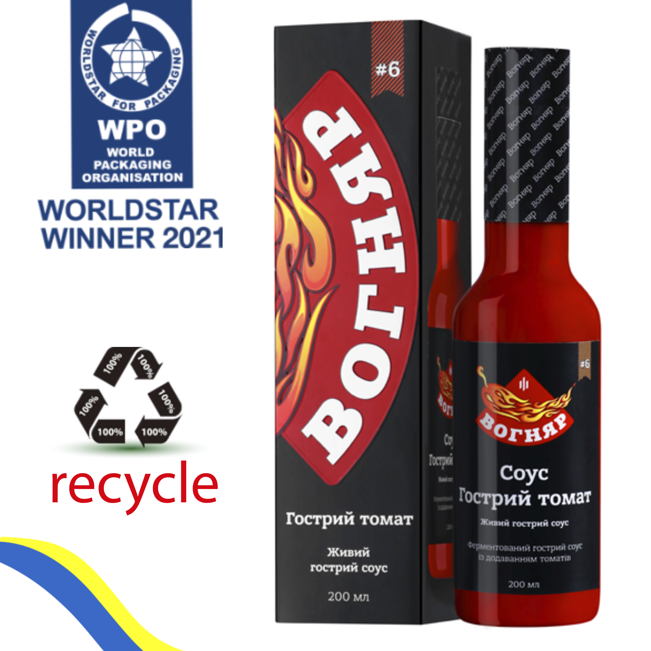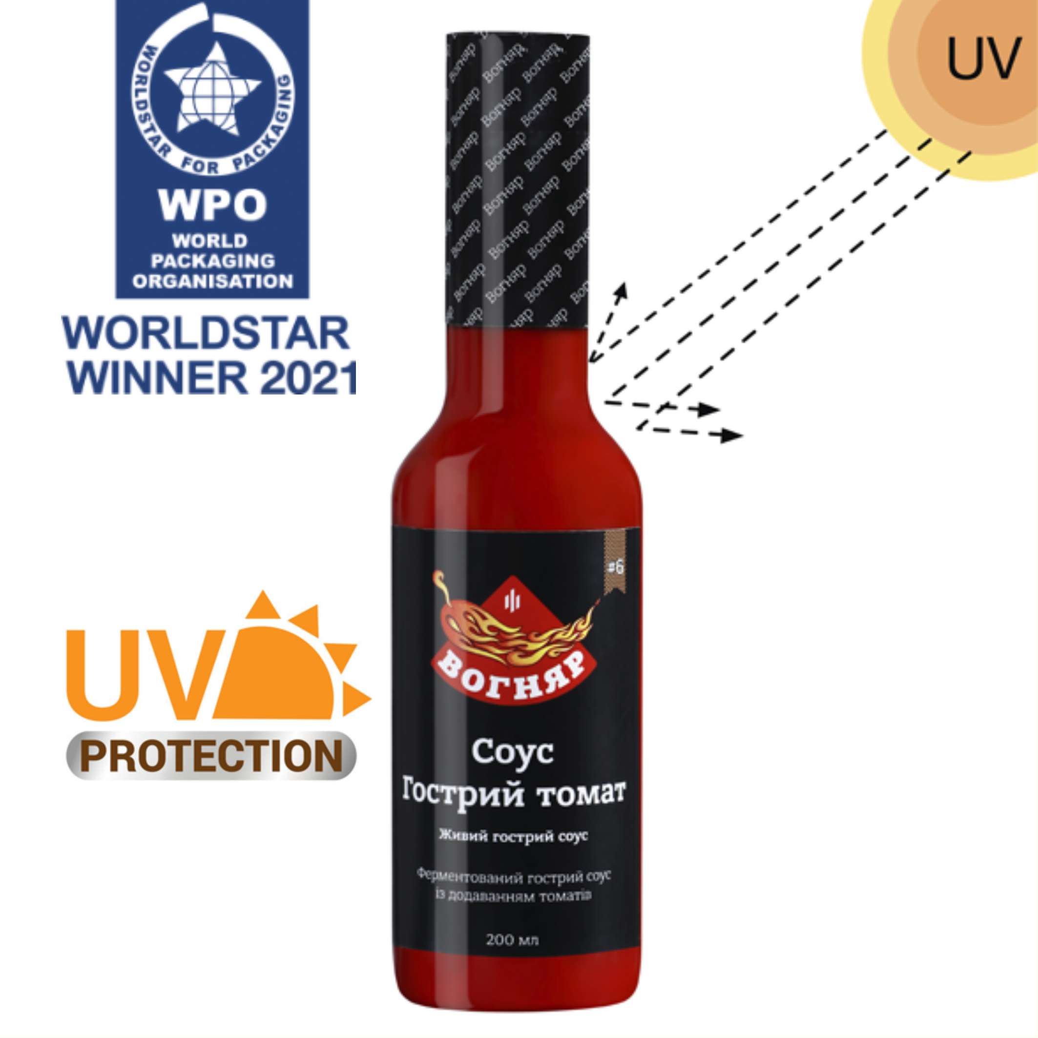 Полимерный флакон «Вогняр» завоевал золото в категории «Еда» и получил специальную награду «Packaging that Saves Food». Полимерный флакон «Вогняр» изготовлен с применением защитного барьера от попадания 90% ультрафиолетовых лучей. Инновационная технология изготовления данного флакона позволила сохранить содержание наполнения флакона, а также питательные вещества, запах, цвет и вкус. Данный флакон изготовлен из рПЕТФ и подлежит 100% переработке, поэтому полностью органический. Технология изготовления заключается в поглощении УФ излучения и рассеивает его как тепло, что позволяет увеличить срок хранения продукта. За счет этого прогнозируется увеличение объемов продаж на 15%. Флакон изготовлен из сырья высокого качества, прочный, легкий, удобный для транспортировки, устойчивый к внешним факторам.