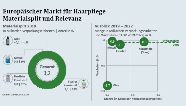 Преобладающим упаковочным материалом с долей 68% является жёсткий пластик, при этом наибольший рост продаж наблюдается в металлической упаковке и составляет 0,9% в год. Доля частных марок средств по уходу за волосами очень мала: 4,2% в Европе. На глобальном уровне Азия является крупнейшим рынком по объёмам, но наибольший рост до 2022 г. будут иметь Ближний Восток и Северная Африка.