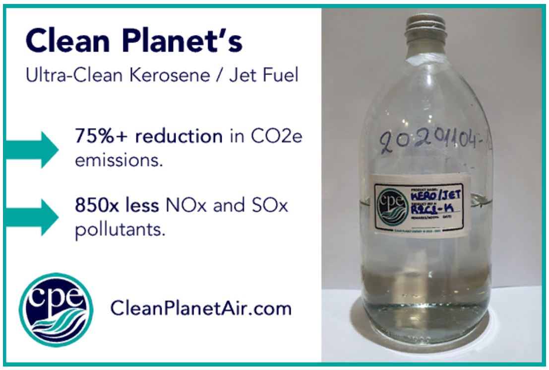 Британская компания Clean Planet Energy объявила о выпуске нового продукта в рамках реализации задач по значительному сокращению выбросов углекислого газа на транспорте. Сертифицированный керосин / реактивное топливо под торговой маркой «Clean Planet Air» может использоваться в качестве прямой замены эквивалента ископаемого топлива, но при этом, по сравнению с ним, сокращает выбросы CO2 минимум на 75%, удаляя при этом тысячи тонн отходов пластика из окружающей среды каждый год.