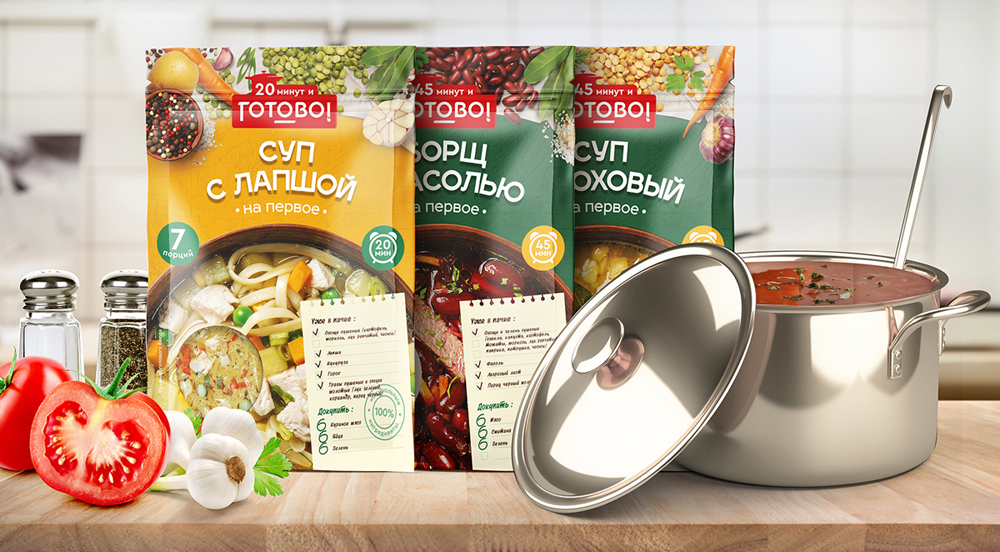 Торговая марка «Готово!» от ТД «Ярмарка» — это натуральные и полезные основы для приготовления простых и популярных блюд в категории ready to cook. Смеси «Готово!» экономят время и силы потребителей на приготовление, ведь полноценный вкусный обед или ужин быстро и легко приготовить. Ассортимент включает в себя супы, вторые блюда.