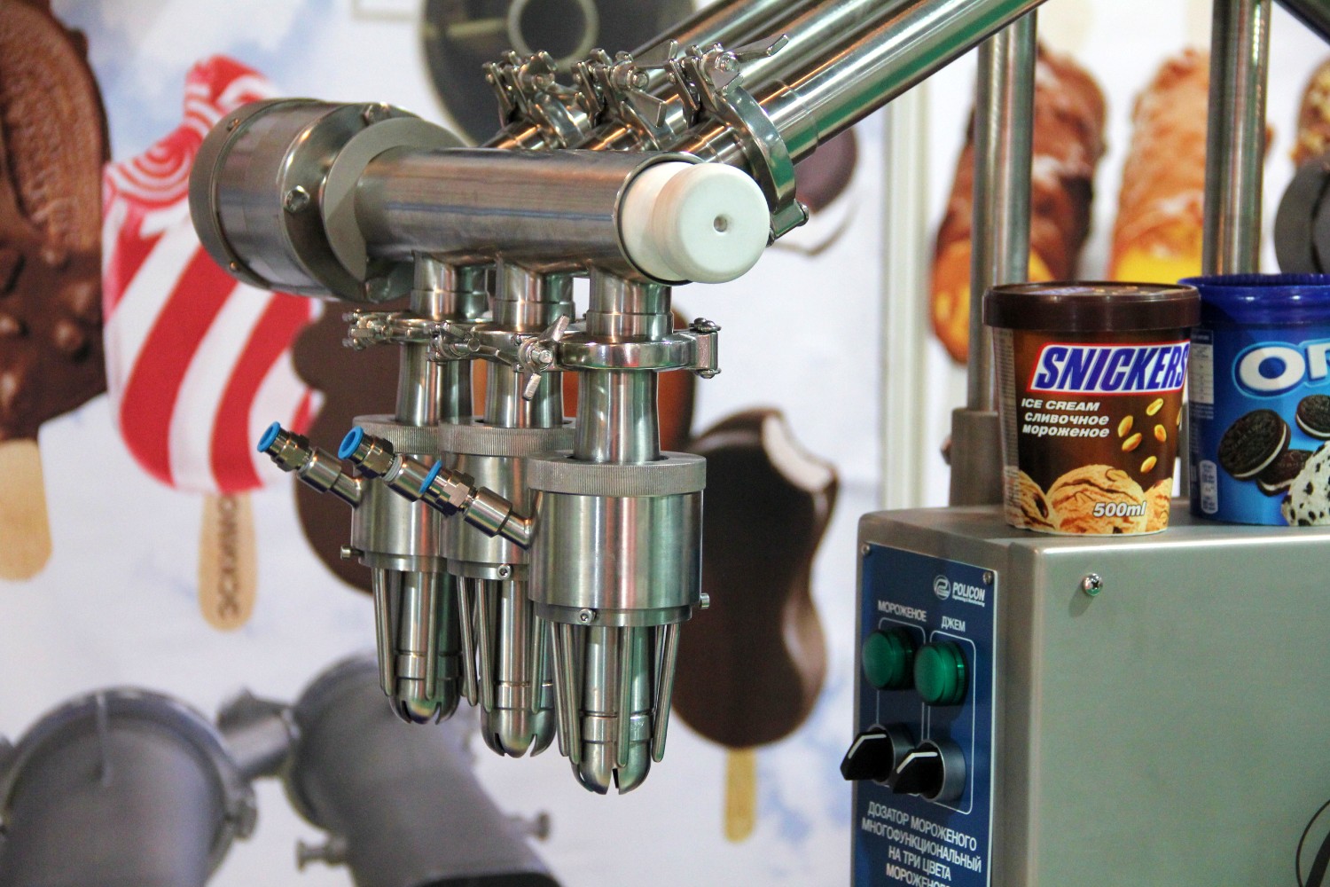 Акционерное общество «Поликон» из Омска – производственно-инжиниринговая компания полного цикла, основанная в 1993 г. – представляет на международной выставке «Продэкспо-2021», которая проходит с 12 по 16 апреля 2021 г. в московском ЦВК «Экспоцентр» на Красной Пресне, многофункциональный дозатор мороженого, позволяющий фасовать сразу три вида мороженого.