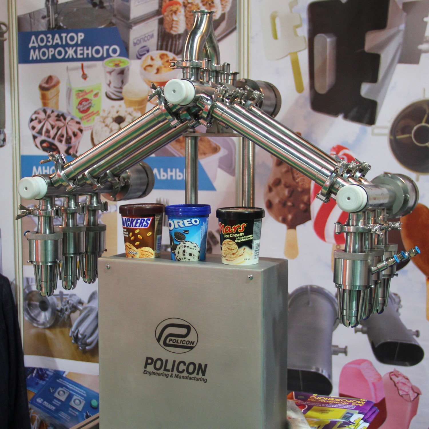 Коммерческий директор АО «Поликон» Денис Черемных рассказал о демонстрируемом оборудовании: « Это уникальный дозатор, дающий возможность фасовать мороженое трёх цветов одновременно. При этом получается красивый, привлекательный для потребителя продукт. В дозатор можно добавлять три различные добавки, например, сгущёнку, джем и какой-нибудь топинг. Получается сладкий продукт, который очень любят дети. И такие сладости особенно любят на Востоке. Демонстрируемый на выставке дозатор мы изготовили для нашего заказчика из Узбекистана. Считаем, что и в России он будет пользоваться популярностью. Это полностью российская разработка, позволяющая на одном оборудовании производить практически все виды мороженого».