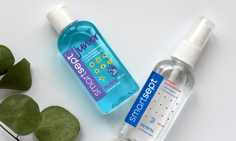 Отвечая на запросы рынка, линейка Smartsept была дополнена детским антисептиком. Субнейминг Junior («младший») смотрится свежо на фоне стандартного «Kids» у конкурентов, органично встраивается в дизайн-код бренд, развивая его: исходный минималистичный дизайн взрослого «Смартсепта» как будто дофантазирован ребенком: приписанное от руки имя, яркие кляксы-вирусы и главный герой, малыш Смартсепт со взъерошенной челкой — все это делает суббренд живым, позитивным и привлекательным для своей аудитории.