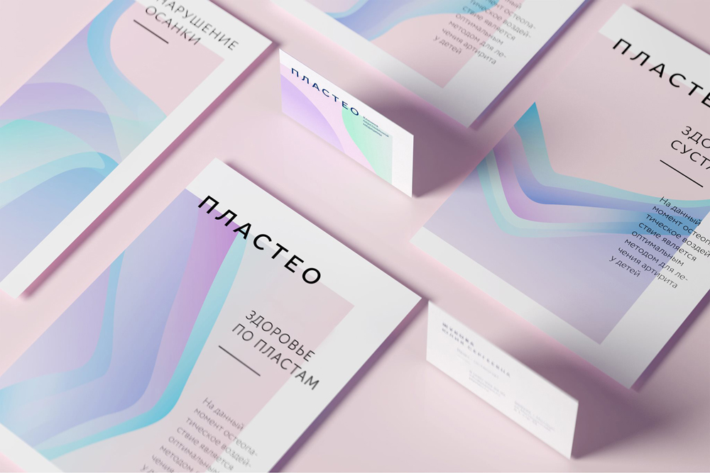 Пластео — название, которое напрямую отражает позиционирование бренда. Здесь пациента обследуют «по пластам» — комплексно и с учетом индивидуальных особенностей. Мягкое звучание и четкая семантика подчеркивают деликатное отношение, точность и высокий сервис клиники. В основу дизайна легли абстрактные «пласты» — наслоения полупрозрачных форм. Они, как мышцы, связки и суставы, формируют узнаваемые силуэты: колени, локти, стопы, спину, шею. Вдохновением стали изображения в анатомических атласах, где каждая мышца обозначена своим цветом. Дизайнеры разработали не буквальные изображения тела, а только намек на них.