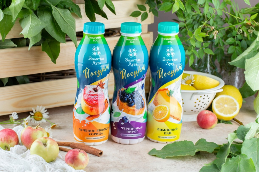 Питьевой йогурт торговой марки «Золотые луга» выпускается в удобной ПЭТ-бутылке с ярким дизайном. В десертную коллекцию вошли вкусы: печеное яблоко – корица, лимонный пай и черничный пирог.