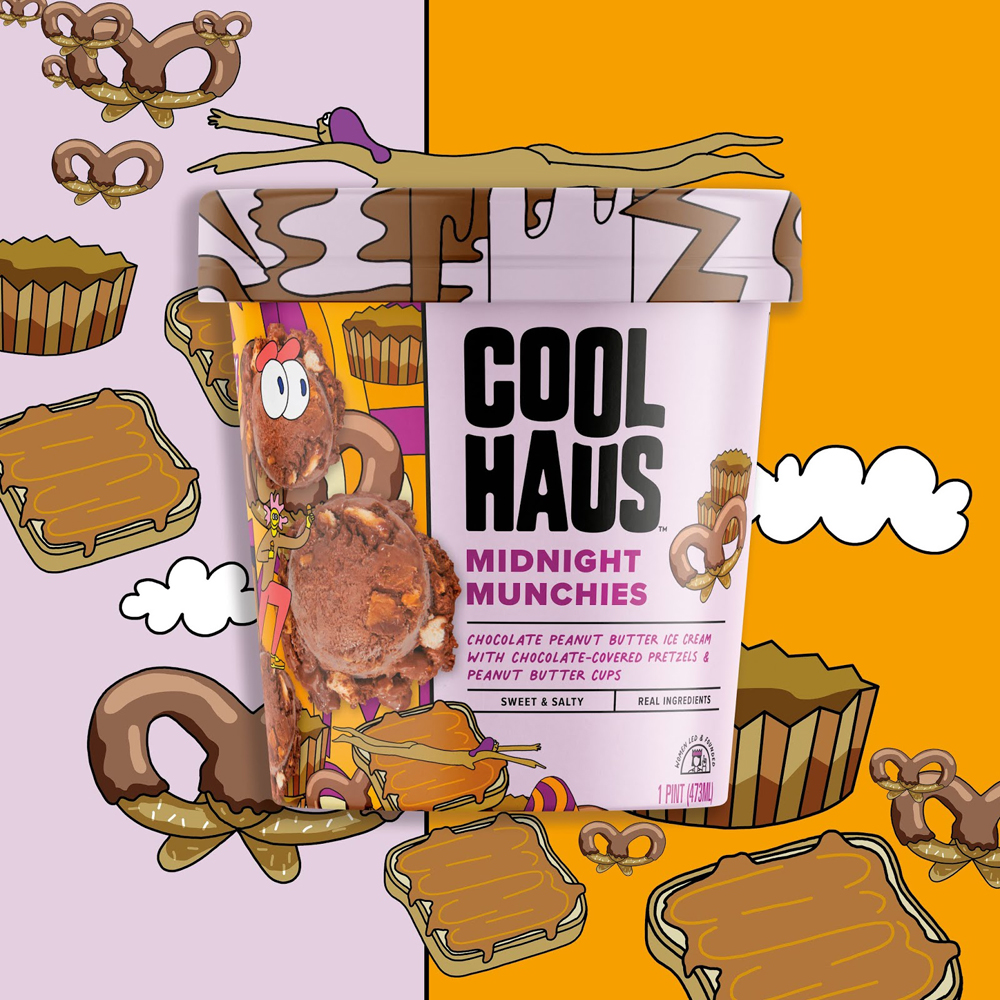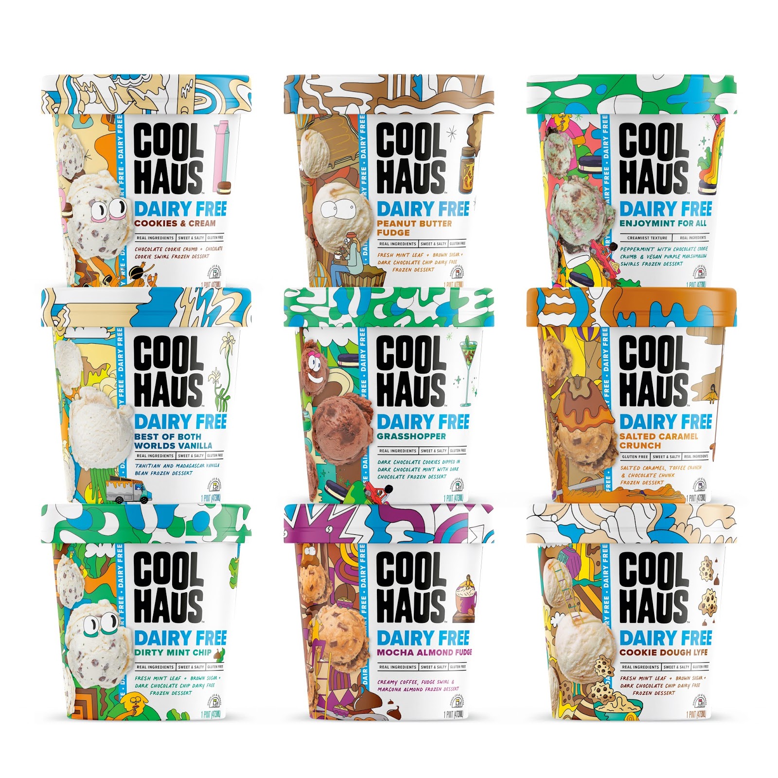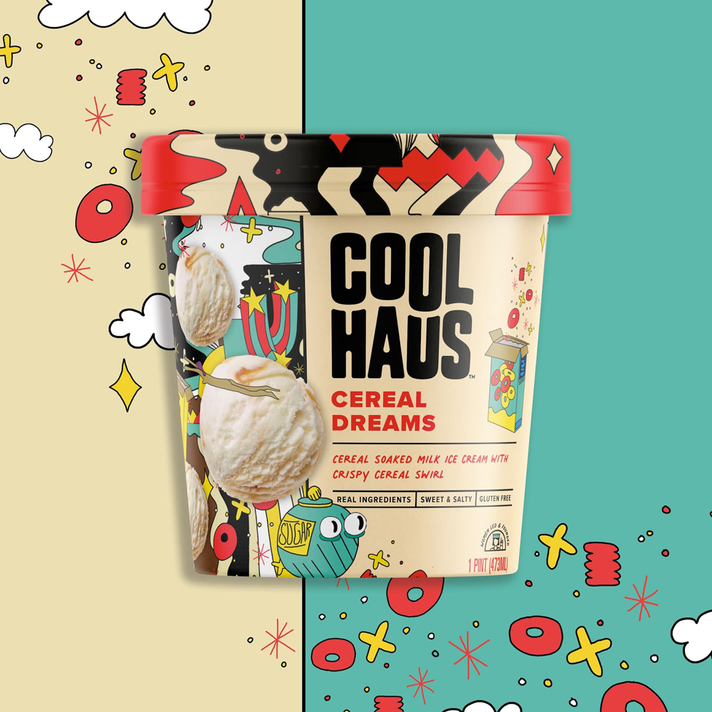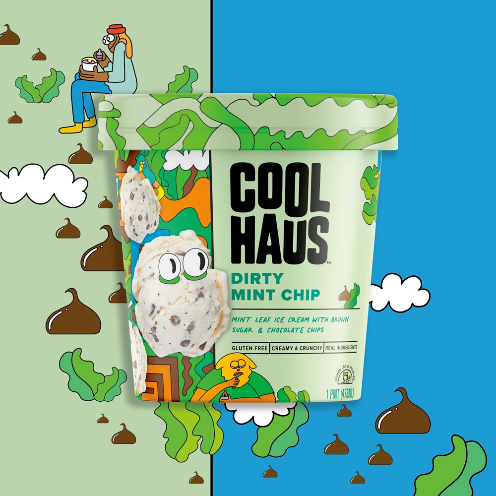 Десять лет Coolhaus производит мороженое с необычными вкусами и нетривиальными названиями. Задача дизайнеров состояла в том, чтобы освежить упаковку и передать ключевые характеристики бренда: индивидуальность, веселье, провокационность. Кроме того, нужно было развести две линейки: традиционное мороженое и безмолочное. В работе принимал участие иллюстратор Mike Perry.