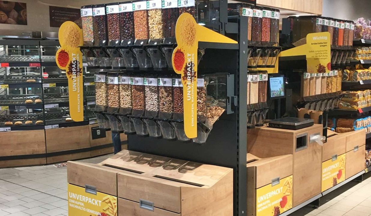 Немецкая сеть супермаркетов Kaufland, входящая в группу Schwarz, испытывает станции по продаже неупакованных продуктов питания, где покупатели могут наполнить свою тару такими продуктами, как макароны, рис и др.