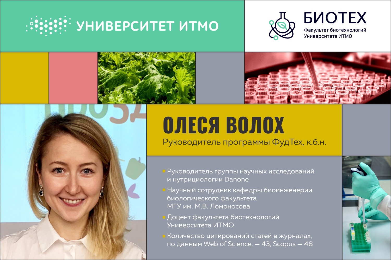 «В компании Danone всегда уделяли большое внимание поддержке талантливых специалистов, которые будут развивать пищевую отрасль в будущем. Сотрудничество ИТМО с Danone Россия позволит обучать новое поколение специалистов в области разработки продуктов питания еще во время учебы в университете и находить лучших студентов с перспективой трудоустройства в нашей компании. Программа «ФудТех» сможет внести значительный вклад в профессиональную подготовку квалифицированных кадров не только для нашей компании, но и отрасли в целом», отметила Олеся Волох, руководитель группы научных исследований и нутрициологии в отделе исследований и инноваций компании Danone Россия, член преподавательского состава и руководитель образовательный программы «ФудТех».